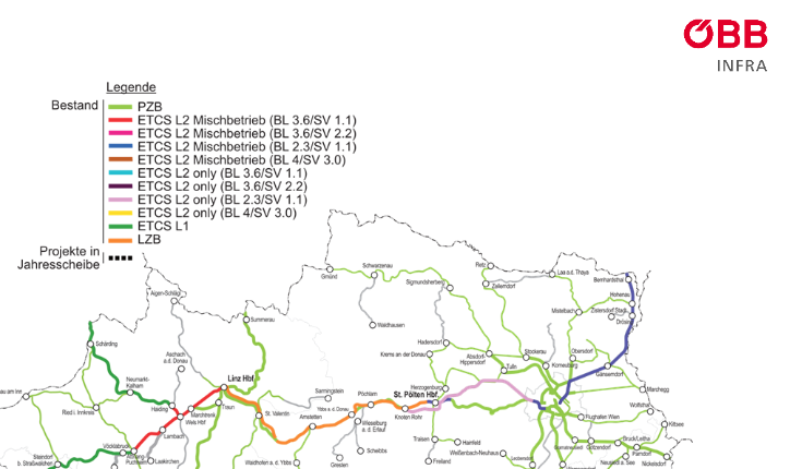 In folgender Grafik ist der Ausbauzustand von PZB über LZB zu ETCS Level 1 und Level 2 dargestellt